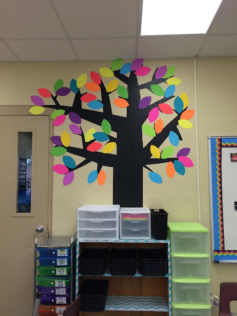 Continuing along the wall opposite of the window is my guided reading area. The giant tree on my wall was made from Maria's